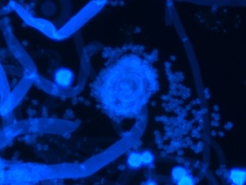 - Der Fluoreszenzmarker Mykoval bindet spezifisch an Pilzzellwandkomponenten und erhöht den Kontrast der Pilzelemente gegenüber dem Hintergrund.