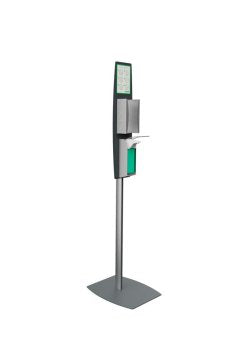 - Varianten der Hygieneeinheit: Version 1 mit Seifen- und Desinfektionsspender 1000 ml plus Hinweisschild; Version 2 mit Halter aus Edelstahl; Version 3 mit Edelstahlhalter und Hinweisschild; Version 4 mit Sensor-Desinfektionsspender 1000 ml plus Schild; Version 5 mit Sensorspender und Edelstahlhalter.