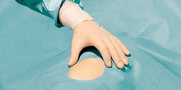 - Selbstklebender Lochausschnitt ermöglicht eine sichere, präzise Begrenzung des Inzisionsbereichs.