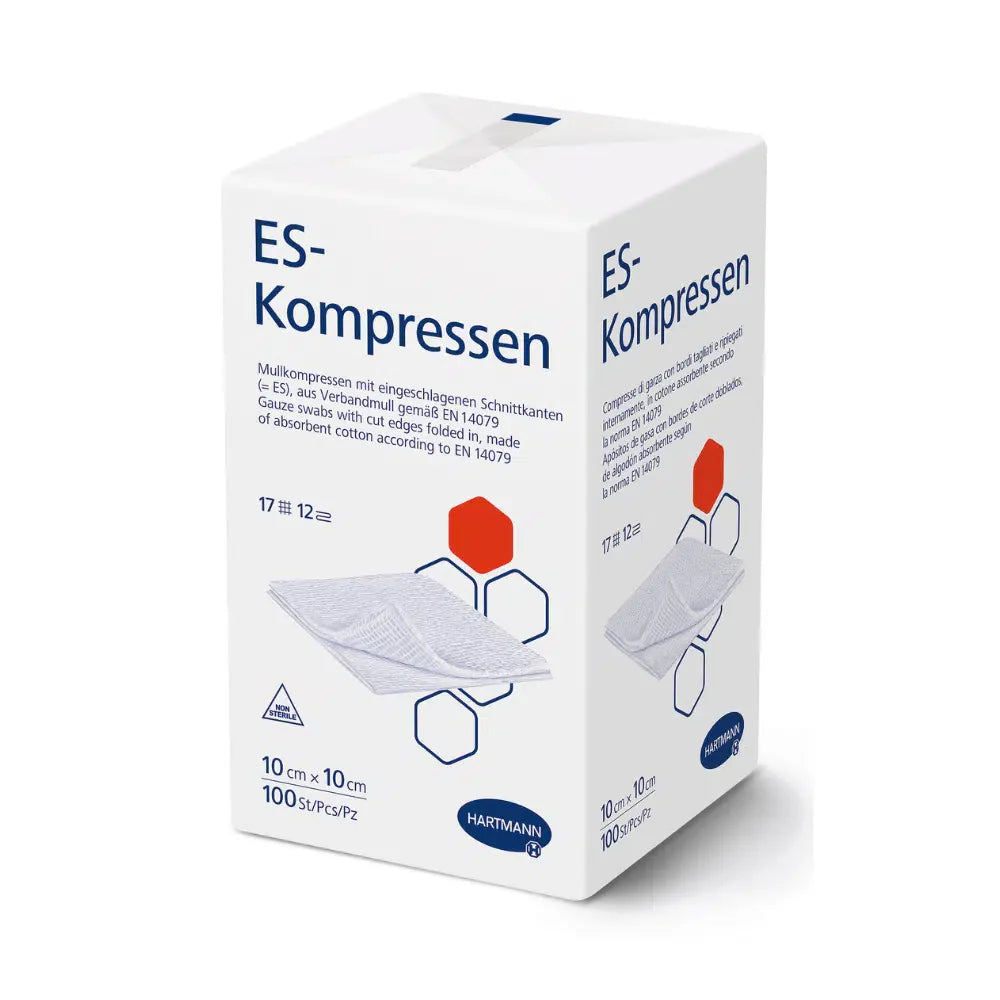 Die unsterilen ES-Kompressen von Hartmann dienen der Wundversorgung in Praxis, Klinik und Pflegeeinrichtungen. Sie wurden entwickelt, um verschmutzte und sezernierende Wunden abzudecken, zu reinigen und Infektionen zu kontrollieren, wobei sie sich auch bei kleineren operativen Eingriffen bewähren. Die 17-fädigen Mullkompressen verfügen über eingeschlagene Schnittkanten (ES), wodurch Randfäden reduziert werden und die Kompressen auch mehrfach aufgeklappt verwendet werden können, ohne dass sich störende Fäden lösen. Das Material bietet eine ausgezeichnete Saugfähigkeit und ist zugleich weich und geschmeidig zur Haut. Die ES-Mullkompressen sind luftdurchlässig und in verschiedenen Verpackungsgrößen sowie Lagerarten erhältlich. Als unsterile Ausführung eignen sie sich für allgemeine Wundversorgung außerhalb steriler Anwendungen und werden in der Praxis gemäß Hygiene- und Abfallvorgaben genutzt. Die Kompressen entsprechen DIN 61630 und EN 14079 und sind damit standardkonform.