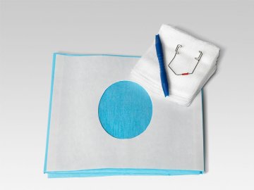 - Komponentenliste umfasst Lidsperrer mittlerer Größe, Skleralmarker 3,5 x 4,0 mm, fünf Mullkompressen 7,5 x 7,5 cm, ein selbstklebendes Lochtuch 50 x 60 cm (2-lagig) mit Lochung 6 x 8 cm sowie ein Tischabdecktuch 150 x 100 cm (2-lagig).