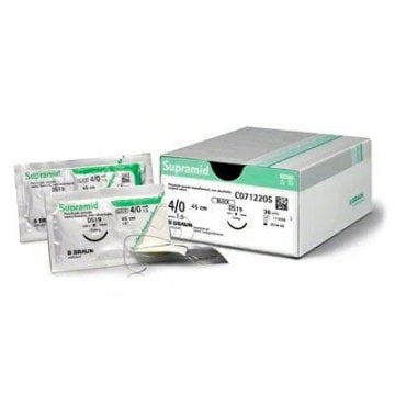Lieferumfang: 36 Stück Supramid schwarz, 4/0, metrische Größe 1,5, DS19, Länge 75 cm, Fadenseele aus Polyamid 6.6 und Mantel aus Polyamid 6, in sterilem Beutel verpackt. Die Verpackungseinheit entspricht einer Packung mit 36 Stück.