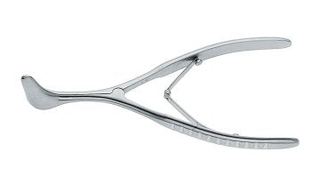 - Beim Zusammendrücken des Griffes spreizen sich die Spekula-Zweige, wodurch Nasenwände und Muschel auseinandergezogen werden und eine bessere Sicht ermöglichen.